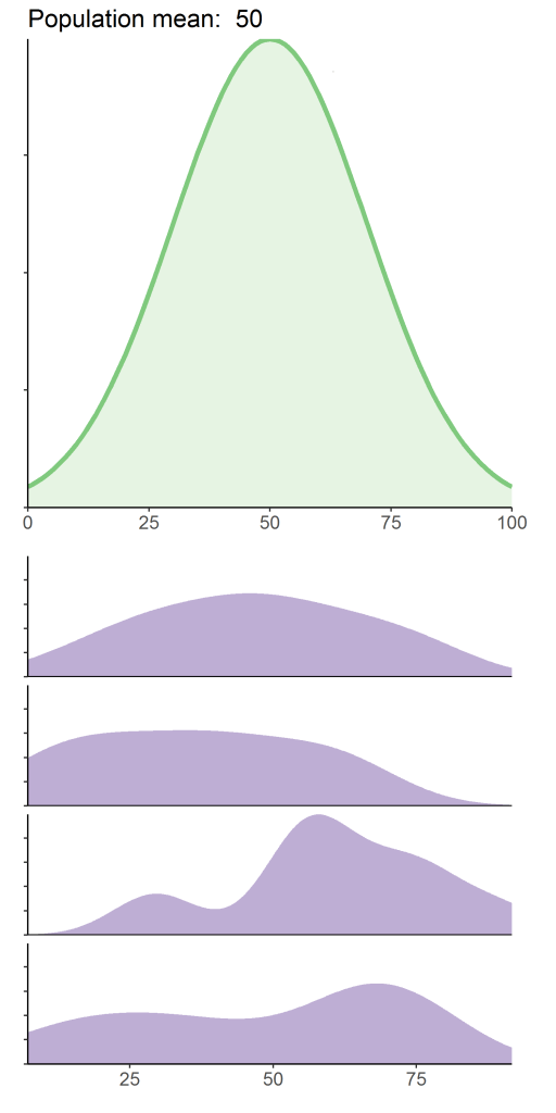 Eso sí, mi generalización tendrá que tener cierto margen de error, ya que cada muestra que extraiga de la población va a ser un poco diferente, debido a ese error de muestreo que habíamos explicado. En la siguiente figura, tenemos la representación de una distribución poblacional (arriba), y algunas muestras pequeñas (cada una con n=5) extraídas de la misma. Podemos ver cómo esas distribuciones no coinciden exactamente con la población: tendrán distintas medias, desviaciones típicas, y forma.