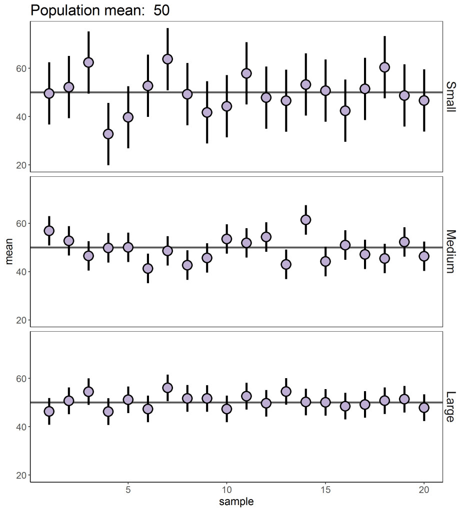 En la siguiente figura, tenemos un ejemplo de todo lo que estoy contando. A partir de una población con media μ=50, hemos extraído 20 muestras. De arriba a abajo, los paneles difieren en el tamaño de esas muestras: pequeño (n=5), mediano (n=10), y grande (n=200). Los puntos representan la media obtenida en cada una de las muestras, con sus respectivos intervalos de confianza.