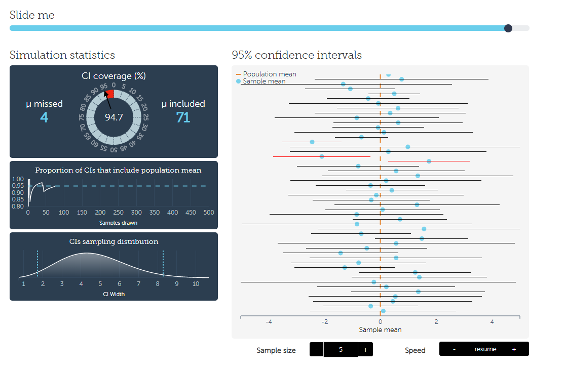 En primer lugar, la mejor manera de entender ciertos conceptos estadísticos es simularlos y visualizarlos. Recuerdo la de veces que, en clase, me hablaron de intervalos de confianza, ¡la de veces que los calculé! Y sólo cuando fui capaz de simularlos y observarlos en movimiento entendí realmente su utilidad… y por qué los interpretamos mal.
