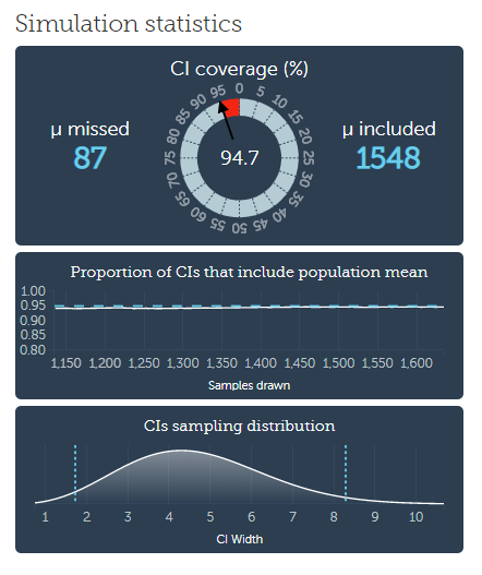 En cuanto a los intervalos de confianza, estos van a contener dentro de sus límites el valor real de la población casi todo el tiempo (de hecho, el 95% de las veces, si no tocamos nada en la simulación). Cuando el intervalo no contiene a la media, aparece resaltado en color rojo. Además, el panel izquierdo de la simulación nos lleva la cuenta del número de intervalos que capturan la media real, para que comprobéis que a la larga va a coincidir con el nivel de confianza (en el ejemplo de la imagen de abajo, el porcentaje real de intervalos que incluyen la media real es de 94.7%, muy cerca del objetivo de confianza deseado, 95%):