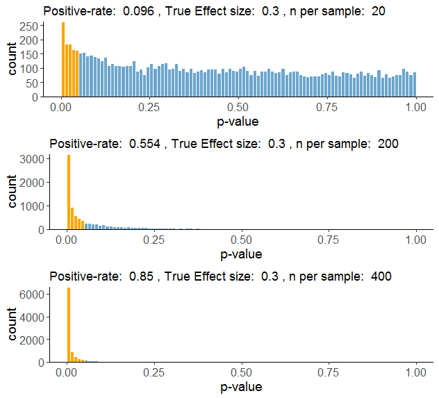 ¿Y para qué queremos saber esto? Bien, creo que una de las cosas que más me ha perjudicado en mi formación estadística es precisamente que no me hablasen de esto mucho antes, desde el principio. Sí, antes de meternos a prender ANOVAs y análisis complicados. Mirar y entender estas distribuciones que os he enseñado arriba es un antídoto contra el autoengaño: es relativamente fácil obtener un p-valor significativo por azar (como vimos en las primeras simulaciones), y es todavía más fácil hacer un estudio y que NO salga significativo por falta de potencia (mirad, si no, la segunda fila del gráfico anterior: el 50% de los estudios van a fallar). Por otro lado, ahora que sabemos cómo se comportan los p-valores en uno y otro caso, podemos planificar con la potencia en mente. Básicamente, la enseñanza que hay que extraer de todo esto es que, si no queremos estrellarnos una y otra vez con un resultado no significativo, necesitamos muestras grandes. Mucho más grandes de lo que solía ser habitual hace unos años en psicología.