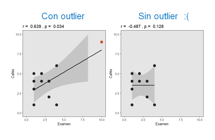 Aprovechando que el otro día estuvimos hablando de las correlaciones, vamos a poner otro ejemplo del peligro de los outliers, quizá más práctico para quien esté trabajando con datos reales. Imaginad que estamos haciendo un estudio sobre el efecto de la cafeína en el rendimiento académico. Así que hemos reunido una muestra de estudiantes a los que hemos preguntado cuántos cafés toman durante la semana, y hemos calculado la correlación de ese número de cafés con la nota de un examen de matemáticas. …Pero resulta que el examen era bastante difícil (casi todo el mundo ha suspendido). Sin embargo, hay una persona que ha sacado un 10. Al ser una nota muy distinta a la del resto de la clase, podemos considerarla una observación extrema, o un outlier.