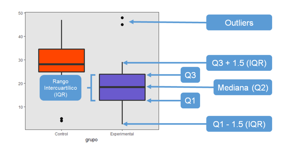 En este tipo de gráficos se representan las distribuciones de los datos de forma un poco diferente, porque se divide la muestra en cuatro porciones de tamaño similar: los cuartiles (primero, segundo, tercero y cuarto, o Q1, Q2, Q3 y Q4). La línea gruesa que queda aproximadamente en la mitad de la caja es la mediana, es decir, el punto de corte que divide a la muestra en dos mitades. A cada lado de la mediana, por arriba y por abajo, se extiende el “rango intercuartílico” (en inglés IQR), es decir, los cuartiles 1 a 3. Los outliers quedan fuera, y se representan en forma de puntos. Son valores extremos, muy improbables dada la distribución de la variable: están más de 1.5 veces el rango intercuartílico por encima del tercer cuartil (Q3), o por debajo del primer cuartil (Q1). Dependiendo del software que utilices, puede cambiar el punto de corte (entre 1.5 y 3 suele variar).